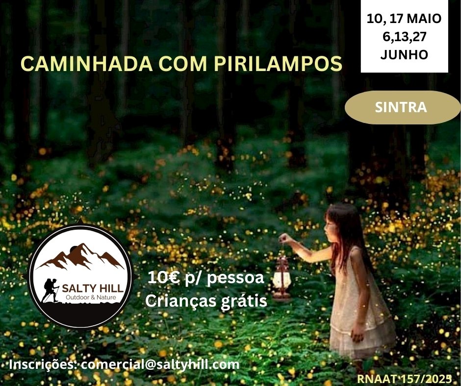 Nos dias 10 e 17 de Maio, 6, 13 e 27 de Junho, a Salty Hill Outdoor & Nature propõe uma caminhada noturna para todas as idades, que nos leva pelos bosques de Sintra, ao encontro dos Pirilampos.